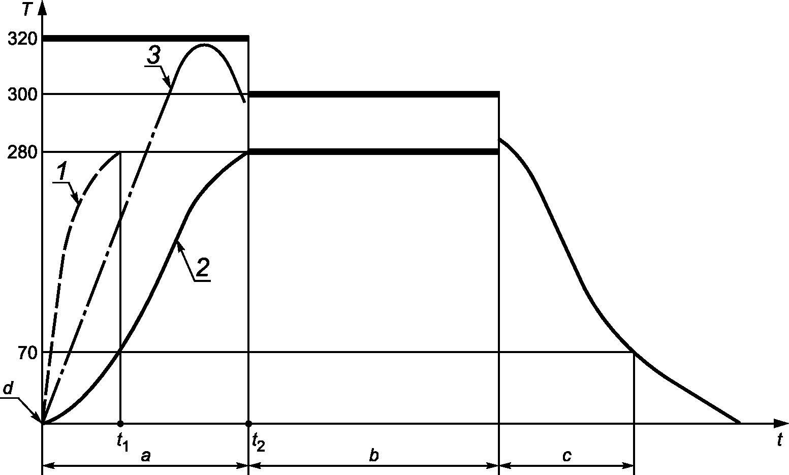 d - температура окружающей среды; a - стадия нагрева;