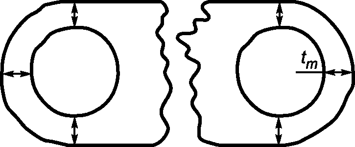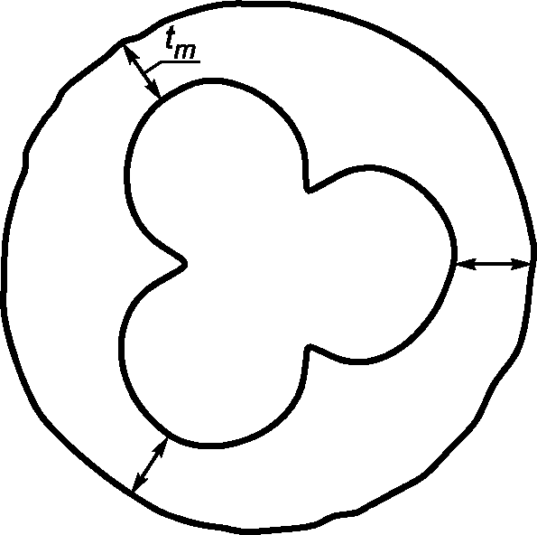c) Если канавки на внутренней поверхности, образовавшиеся при наложении оболочки на изолированные жилы, глубокие, проводят измерения в радиальном направлении от нижней точки поверхности каждой канавки, как показано на рисунке 3.
