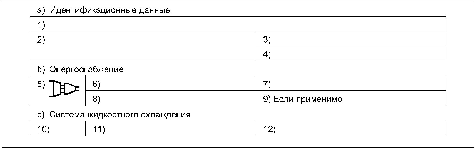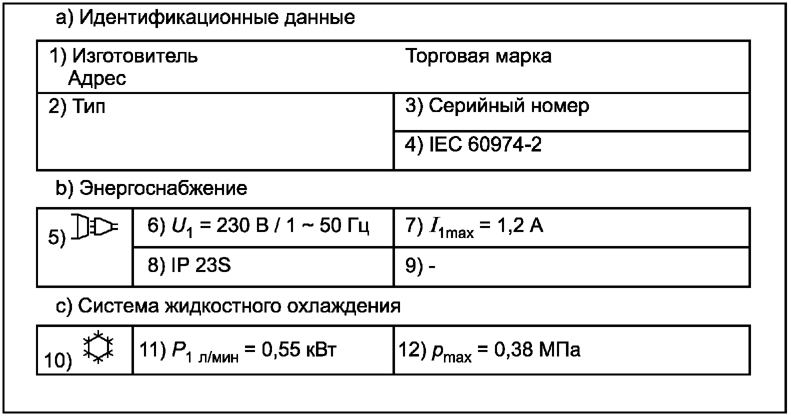 В случае встроенной системы охлаждения, в паспортную табличку источника сварочного тока добавляется пункт c), представленный на