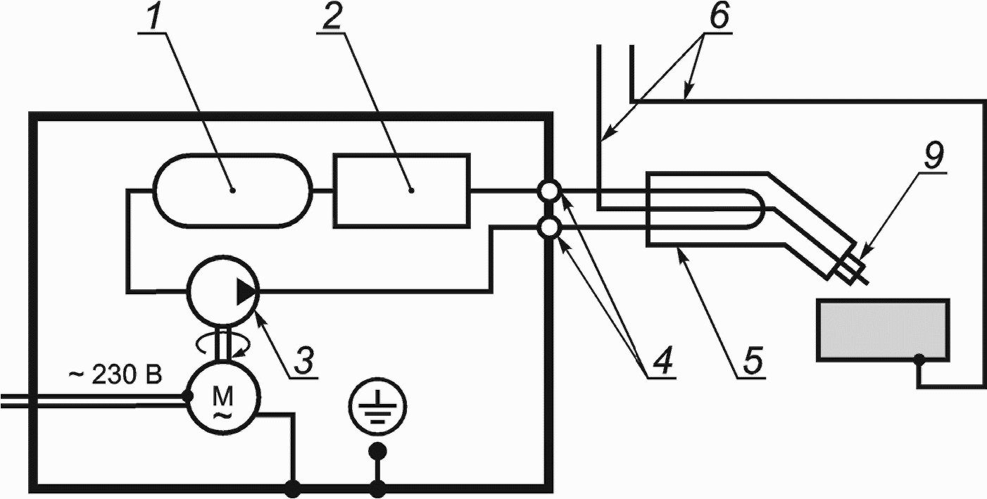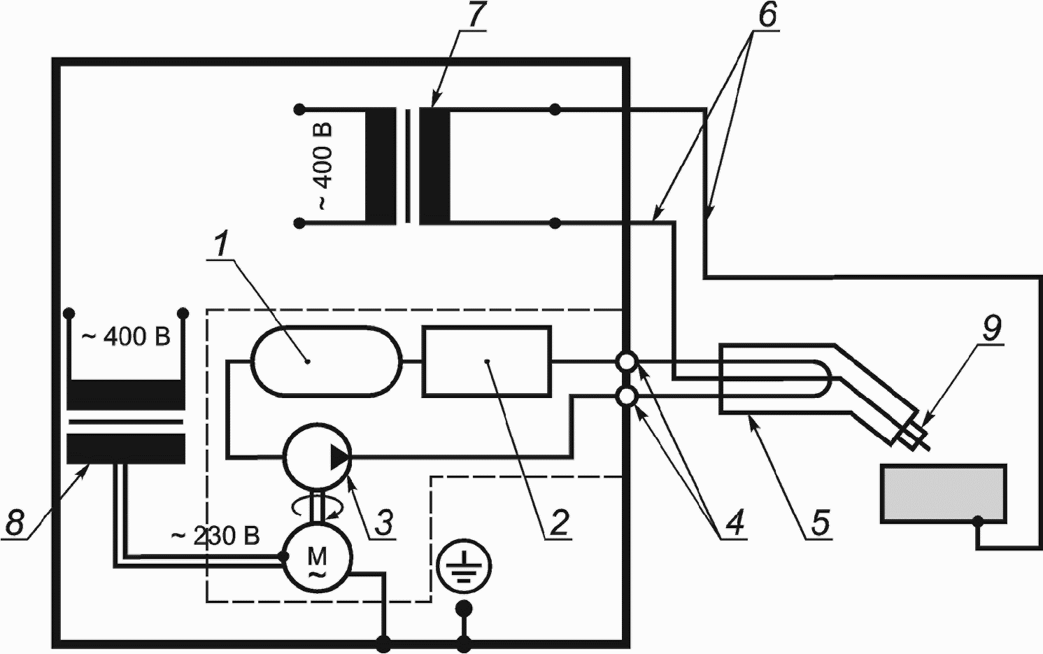 1 - бак; 2 - теплообменник; 3 - насос; 4 - заземленные