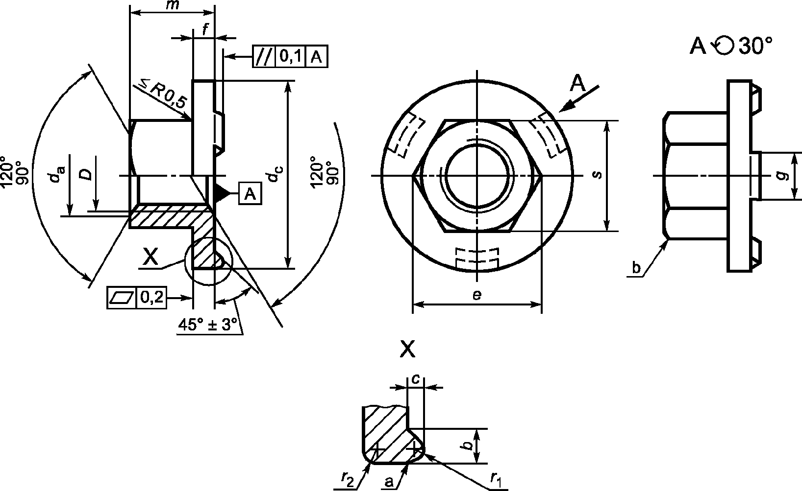 Резьба | | b -0,2 | c +/- 0,1 | da | dc -1 | e | f +/- 0,25 | g +/- 0,1 | m | s h14 | r1 +/- 0,1 | r2 +/- 0,1 | Масса (7,85 кг/дм3) кг/1000 шт. |