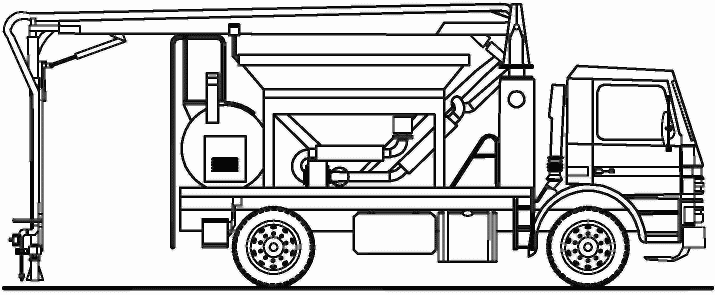 2.7.5 Моечная машина высокого давления с пневматической загрузкой мусора | Резервуар с водой, смонтированный на автотранспортном средстве с распыляющими воду соплами высокого давления и шланга всасывания, расположенного в центральной части шасси | ![]() Рисунок 42 - Моечная машина высокого давления с пневматической загрузкой мусора |