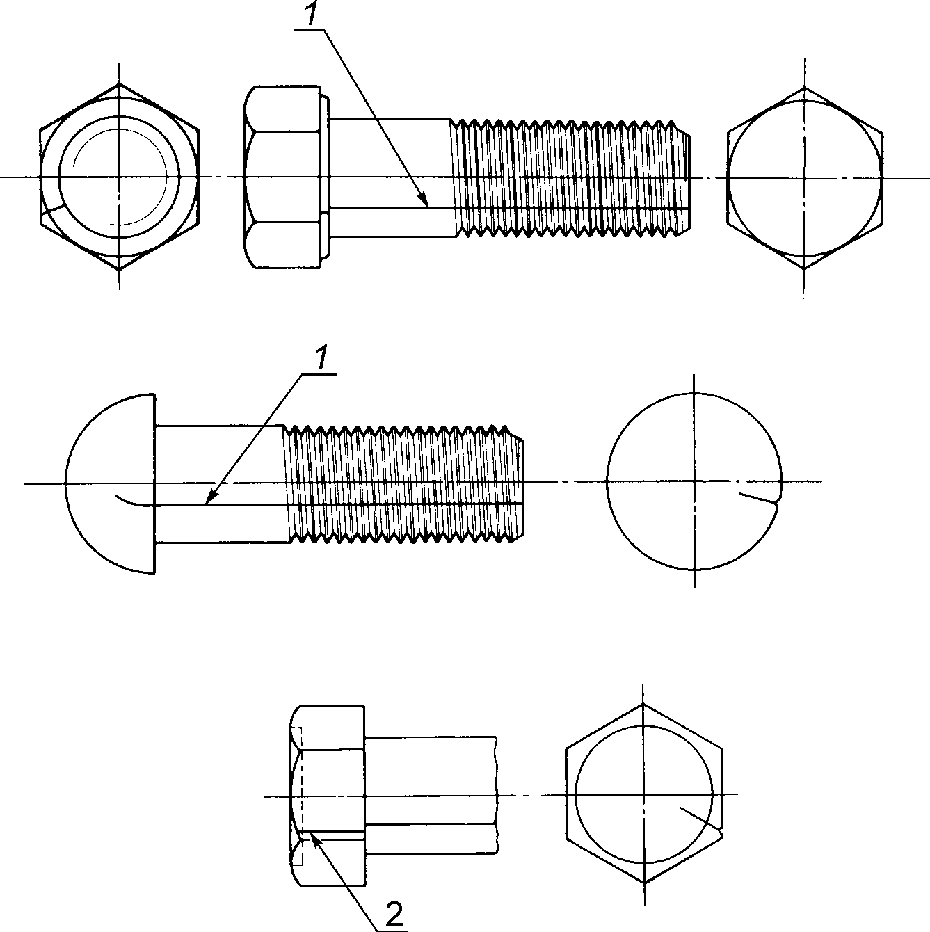 Внешний вид | ![]() 1 - допустимая складка типа "лист клевера" в зоне некруглых подголовков крепежных изделий; 2 - допустимая складка в месте пересечения фланца и приводной части головки; 3 - допустимая складка на поверхности конца болта; 4 - допустимая складка у наружного угла; 5 - недопустимая складка у внутреннего угла |
