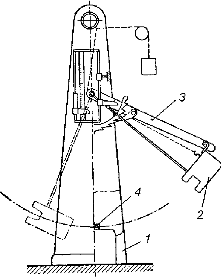 1 - стойки; 2 - маятник; 3 - подъемная рама; 4 - образец