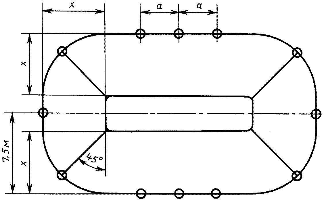 черт. 1. Расстояние между микрофонами, расположенными параллельно боковине подвижного состава, должно быть от 3 до 5 м. Предусматривают на обеих сторонах по три положения для микрофона. У единиц подвижного состава, длина которых превышает 20 м, параллельно боковинам предусматривают более шести положений для микрофона.
