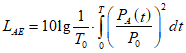 3.3. Уровень звуковой экспозиции единичного шумового импульса (события) LAE, дБA: интегральная величина, характеризующая суммарную акустическую энергию с частотной коррекцией A, воздействующую на человека за время T, с, соответствующее длительности импульса (события), которая определяется по формуле