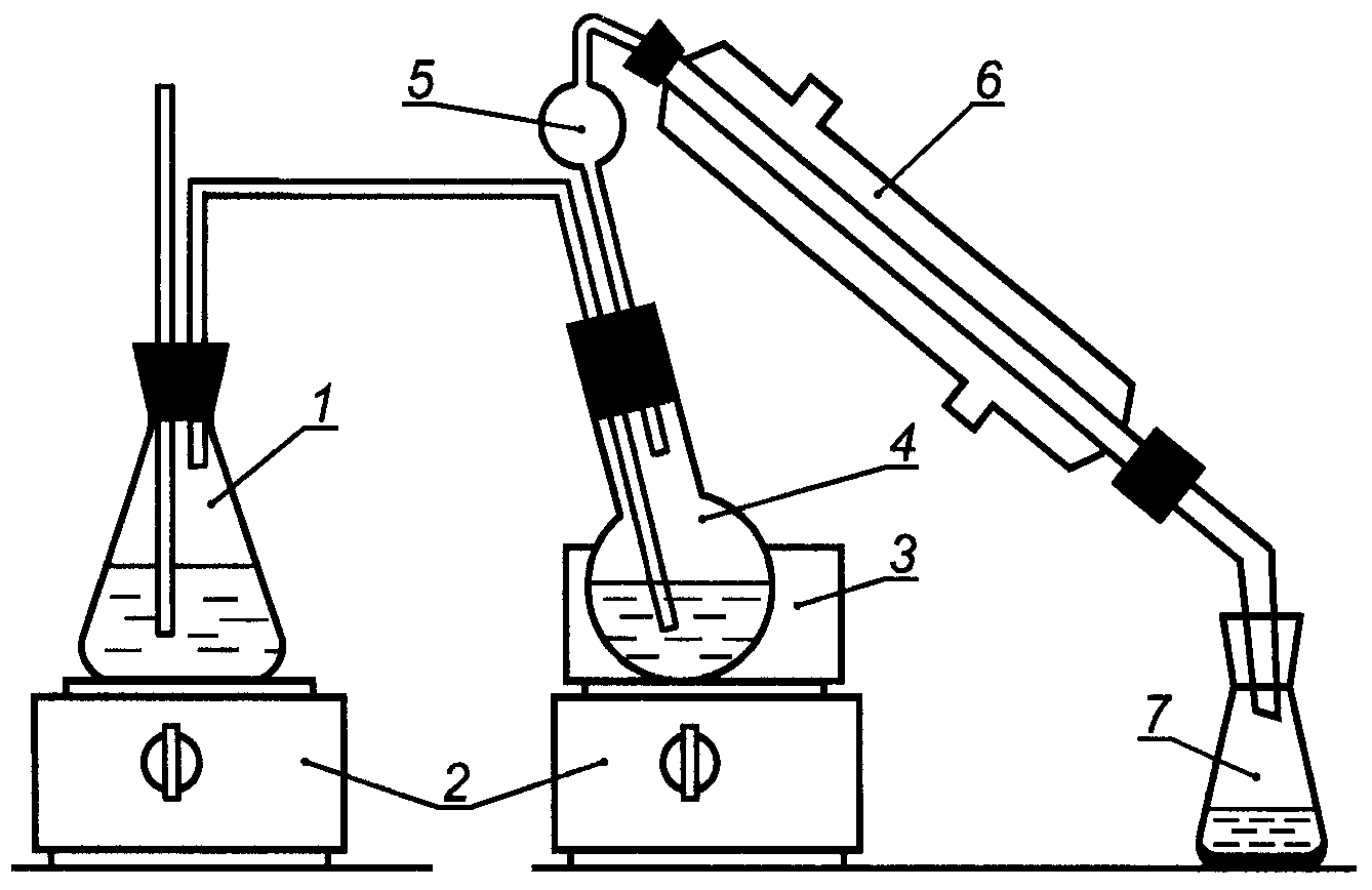 1 - колба коническая вместимостью 500 см3 для получения водяного пара; 2 - плитка электрическая с регуляторами нагрева; 3 - баня с насыщенным раствором хлористого натрия; 4 - колба с исследуемым гидролизатом жира; 5 - каплеуловитель; 6 - холодильник; 7 - приемная колба для дистиллята (колба коническая вместимостью 250 см3)
