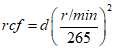 d - диаметр вращения, измеренный между концами противоположных пробирок, установленных в положении вращения, в дюймах.
