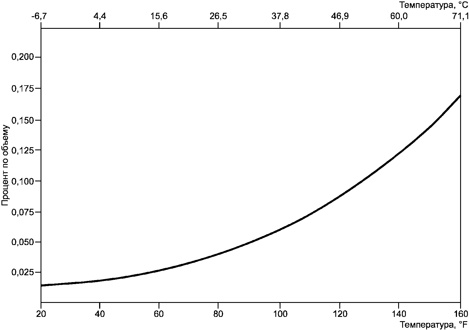 рисунком A.1.1 вода в значительной степени растворима в толуоле. Процентное содержание растворенной воды увеличивается при повышении температуры приблизительно на 0,03% при температуре 21 °C (70 °F) до приблизительно 0,17% при температуре 70 °C (158 °F). Поставляемый толуол является относительно сухим и в случае его использования непосредственно после поставки будет растворять часть или всю воду, присутствующую в пробе нефтяного топлива. В результате указанного растворения будет происходить уменьшение уровня видимых осадка и воды в пробе нефтяного топлива. Для точного определения воды и осадка в пробе нефтяного топлива методом центрифугирования толуол предварительно должен быть насыщен водой при температуре испытания.
