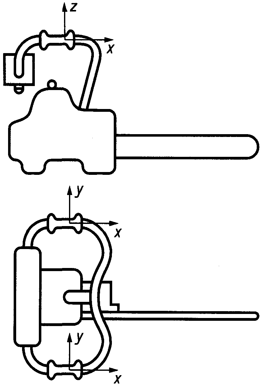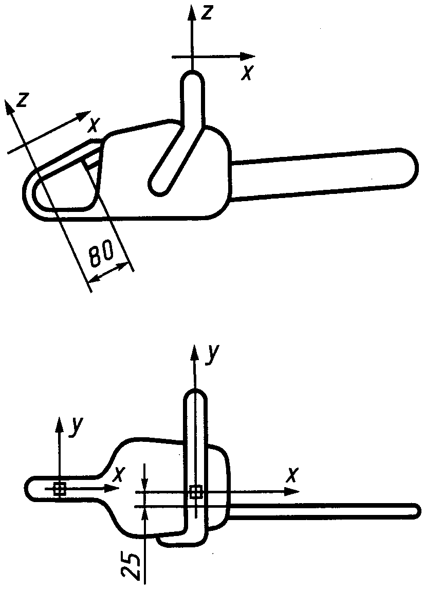 3.1.6. Бензопилы с высокорасположенными рукоятками должны выдерживать нагрузку 200 Н, прикладываемую поочередно в шести направлениях ортогональной системы координат к середине каждой рукоятки бензопилы, закрепленной за пильную шину в положении "Валка".