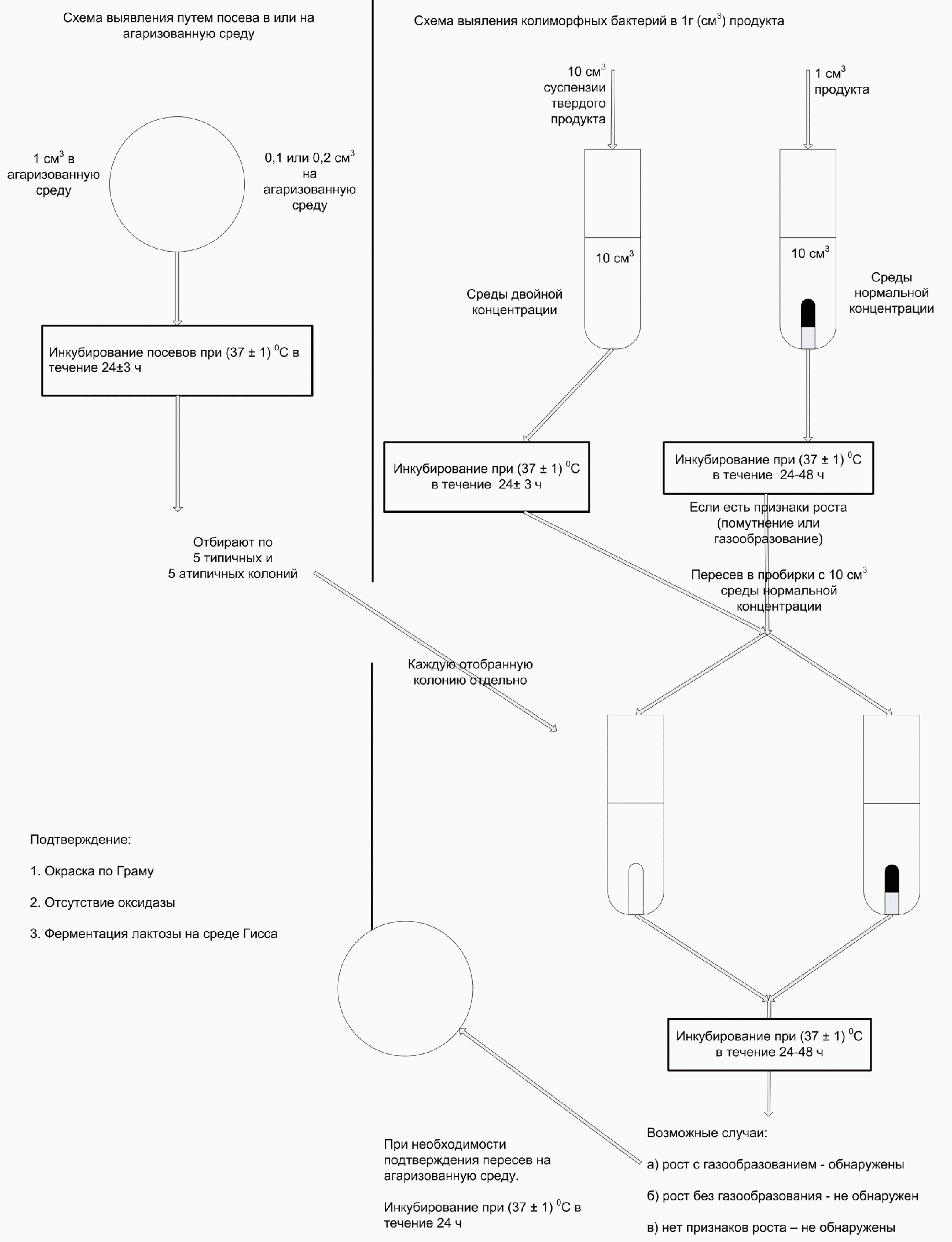 10.1 При необходимости для дополнительного подтверждения принадлежности бактерий, выросших на жидких средах (там, где отмечено газообразование), к колиформным бактериям делают пересевы по ГОСТ 26670 на поверхность одной из агаризованных селективно-диагностических сред (6.5 - 6.7). Посевы инкубируют при температуре (37 +/- 1) °C в течение (24 +/- 3) ч. После термостатирования отмечают рост типичных и атипичных колоний.