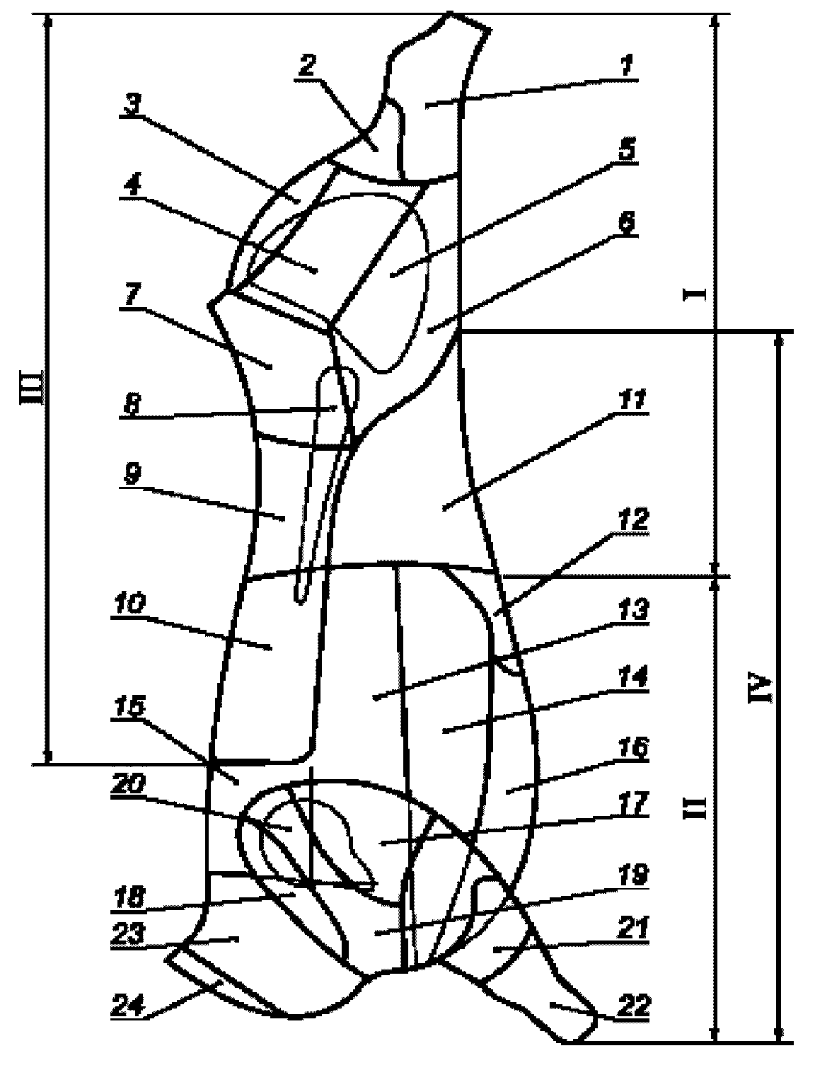 голяшка; 23 - шейный отруб; 24 - шейный зарез