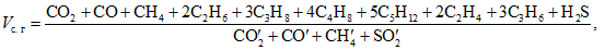 где CO2, CO, CН4, C2H6, C3H8, C4H8, C5H12, C2H4, C3H6, H2S - объемные концентрации компонентов в сухих продуктах сгорания, %.