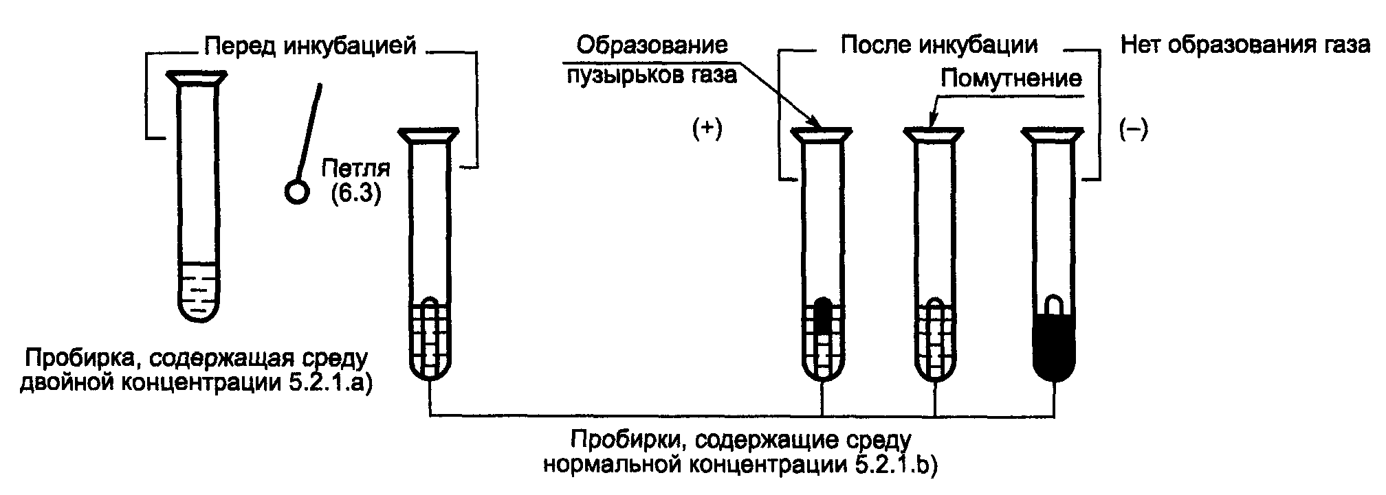 4.2.3. Пробирки с посевами, содержащие селективно обогащенную питательную среду двойной концентрации, выращивают при температуре 30 °C или 37 °C (по договоренности) в течение 24 ч, а пробирки, содержащие селективно обогащенную питательную среду нормальной концентрации, инкубируют 24 ч или 48 ч и после этого пробирки осматривают и отмечают образование пузырьков газа или помутнение, затрудняющее учет газообразования.