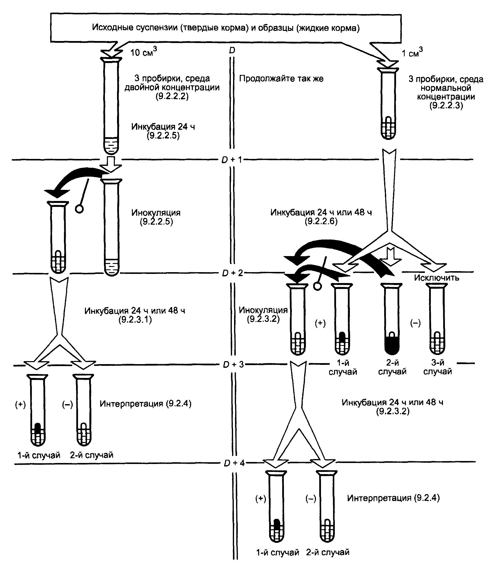 9.1.2.1. В зависимости от требуемого предела обнаружения, x см3 анализируемой пробы, если она представляет жидкий корм, или x см3 исходной суспензии в случае исследования других кормов, переносят в пробирку, содержащую 10 см3 селективно обогащенной питательной среды двойной концентрации