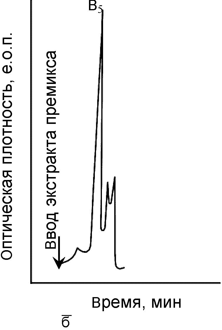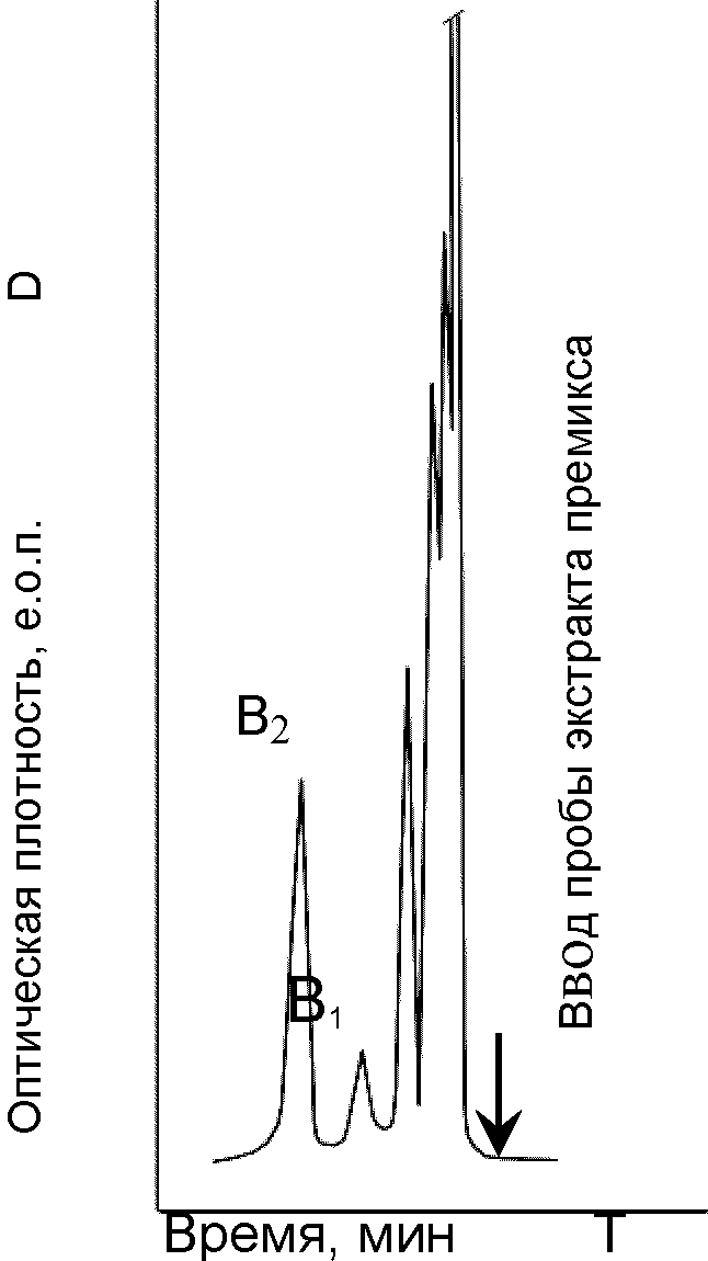 в премиксах проводят два параллельных определения, начиная со взвешивания анализируемой пробы. Каждый экстракт хроматографируют два раза, находят среднеарифметическое значение высоты пиков в единицах оптической плотности или миллиметрах и по градуировочному графику определяют содержание витамина