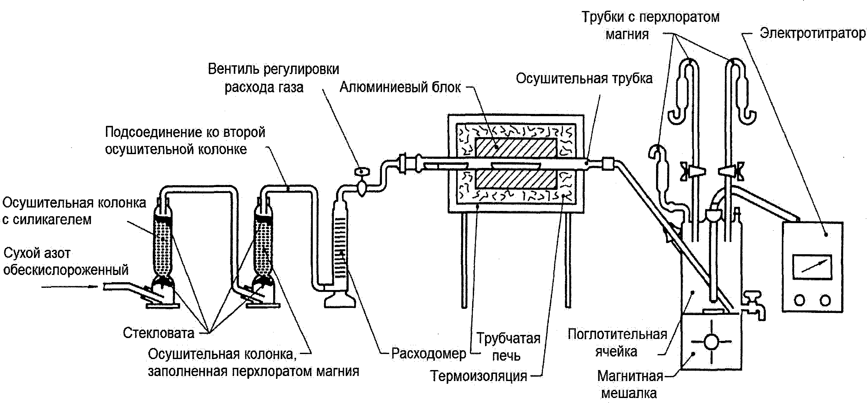 Соответствующее количество одного из перечисленных реактивов помещают в поглотительную ячейку, содержащую этиленгликоль, предварительно оттитрованный до конечной точки в соответствии с