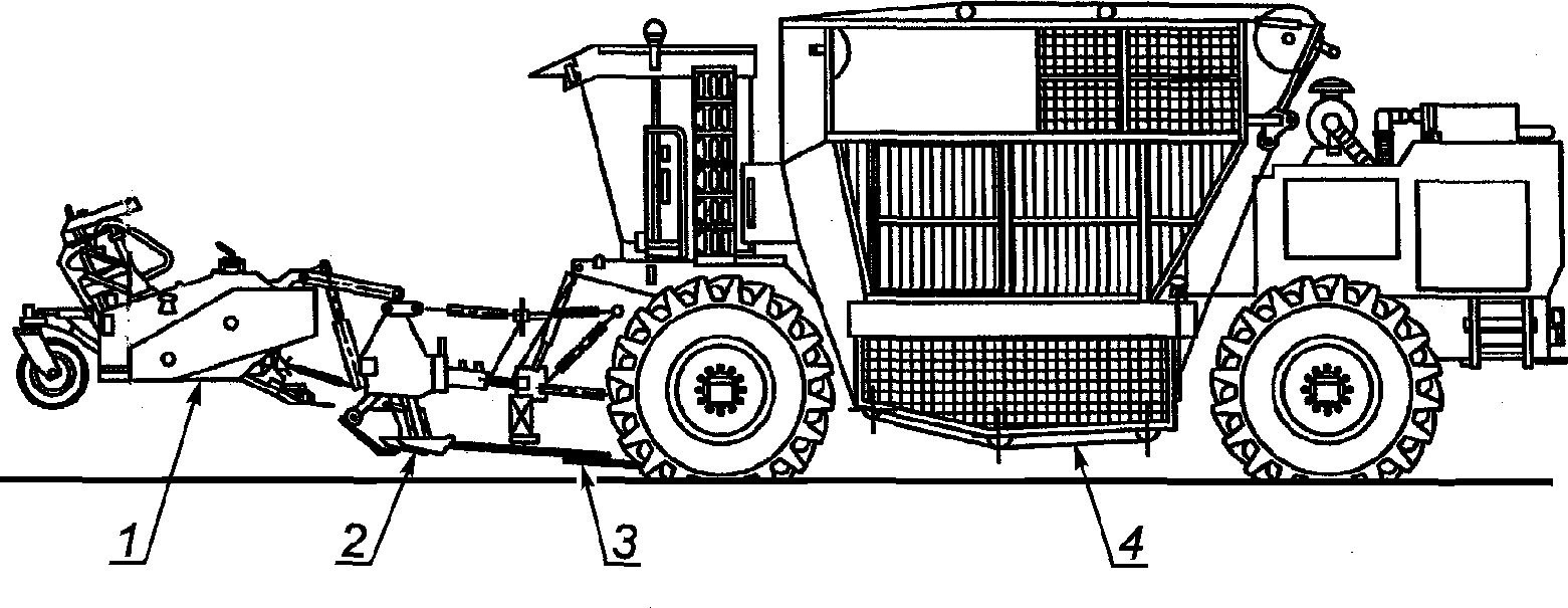 1 - перемещаемый прицеп; 2 - бункер; 3 - лента поднятия