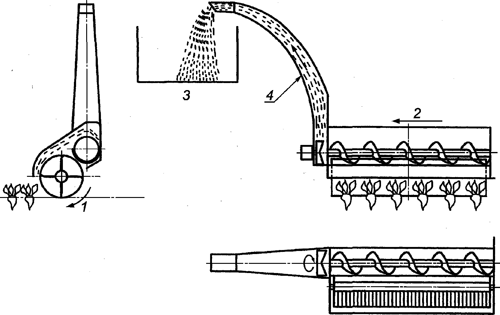 корнеплода; 4 - задняя часть машины
