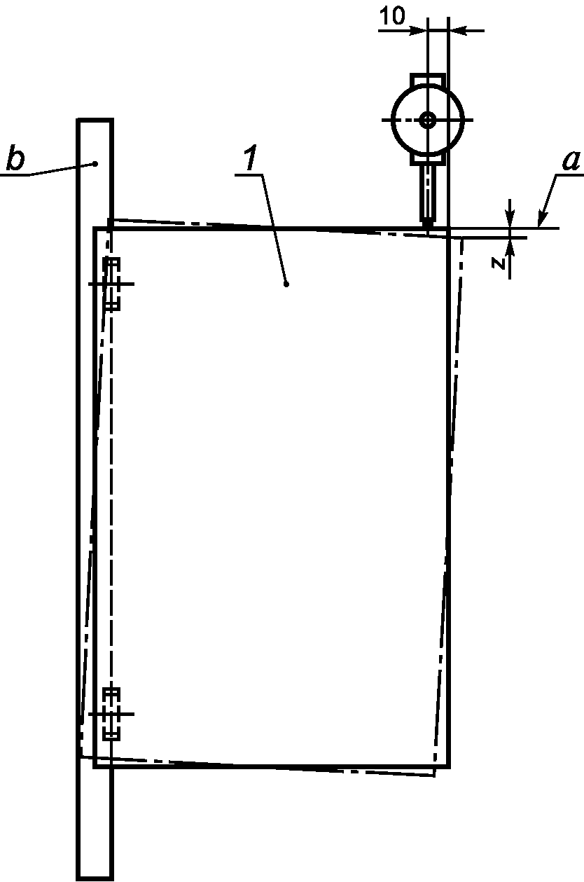 После испытания на долговечность и снятия грузов массой 1 кг следует определить деформацию (проседание) двери (z на рисунке 6) до и после проведения испытания. Погрешность измерений должна составлять +/- 0,1 мм.