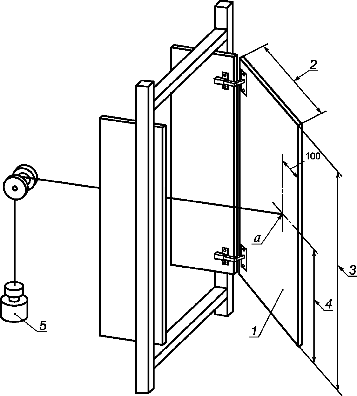 рисунку 3 дверь 10 раз подвергают воздействию горизонтальной статической нагрузки, направленной перпендикулярно к пласти двери и расположенной на расстоянии 100 мм от передней боковой кромки и на 1/2 высоты двери, а также на максимальном удалении от шарнира. Данные о нагрузке приведены в