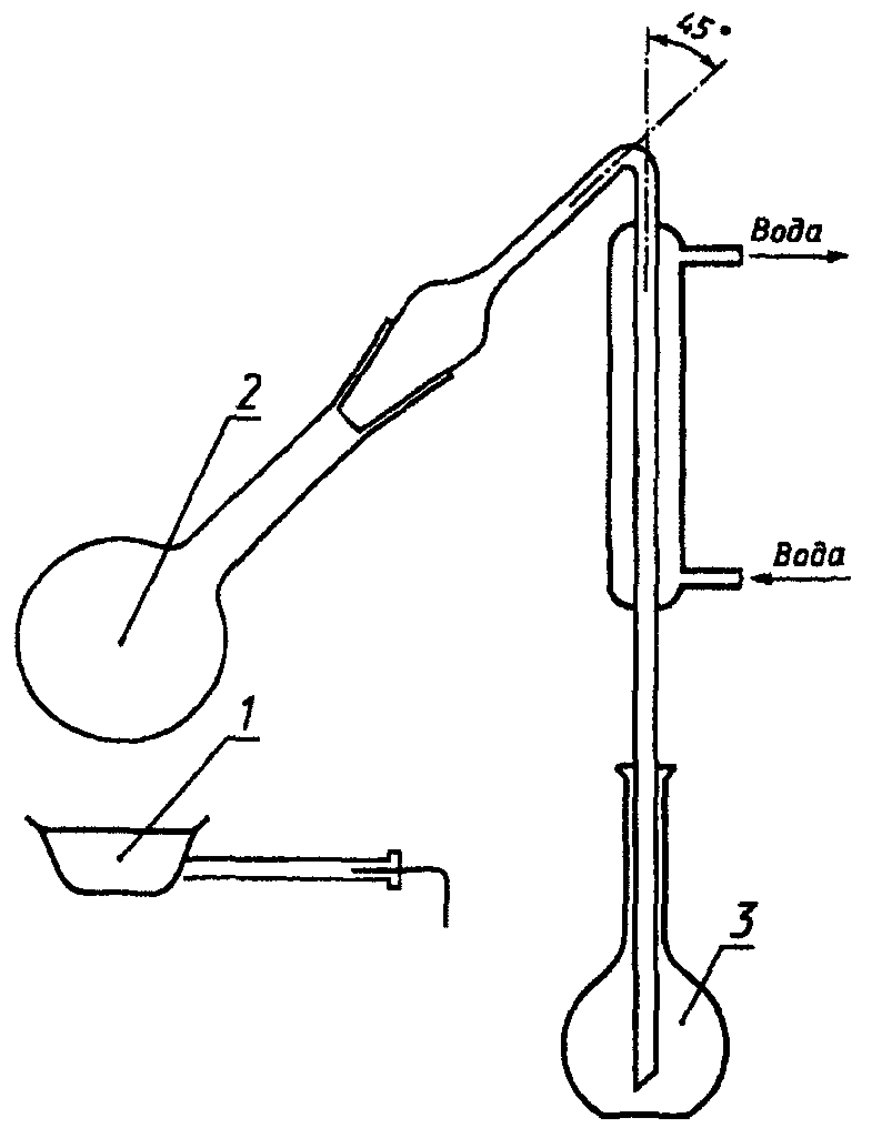 (А.4.6) переносят в химический стакан соответствующей емкости, вводят в него суженное на конус трубчатое продолжение холодильника, так чтобы оно было погружено в раствор серной кислоты