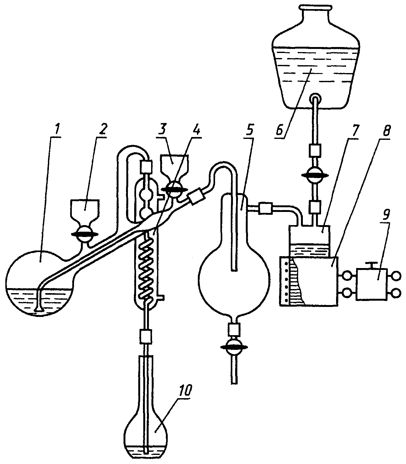 (рисунок 1) состоит из дистилляционной колбы 1, воронок 2 и 3, холодильника 4, колбы-ловушки 5, генератора пара 7, нагревателя генератора пара 8, лабораторного автотрансформатора 9, бутыли с водой 6 и колбы-приемника 10.