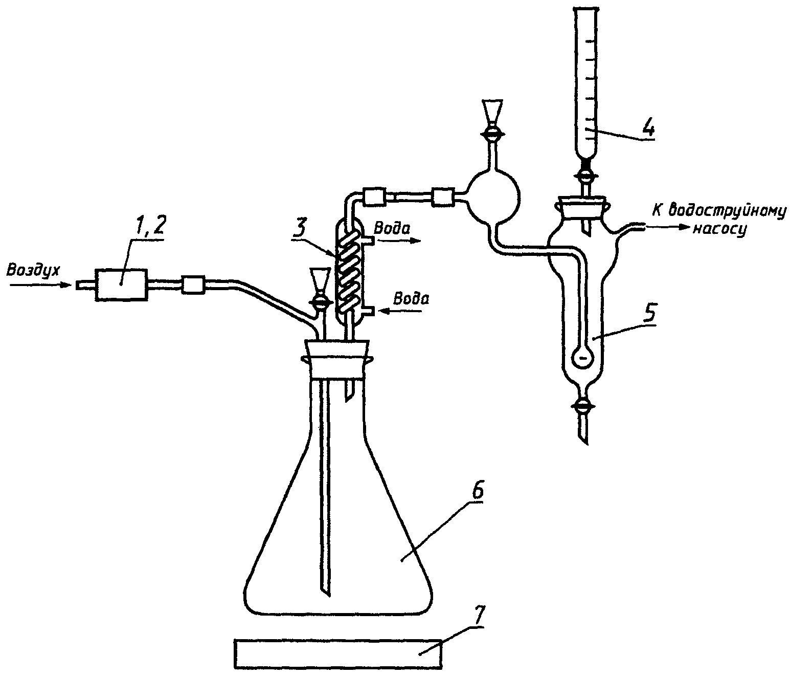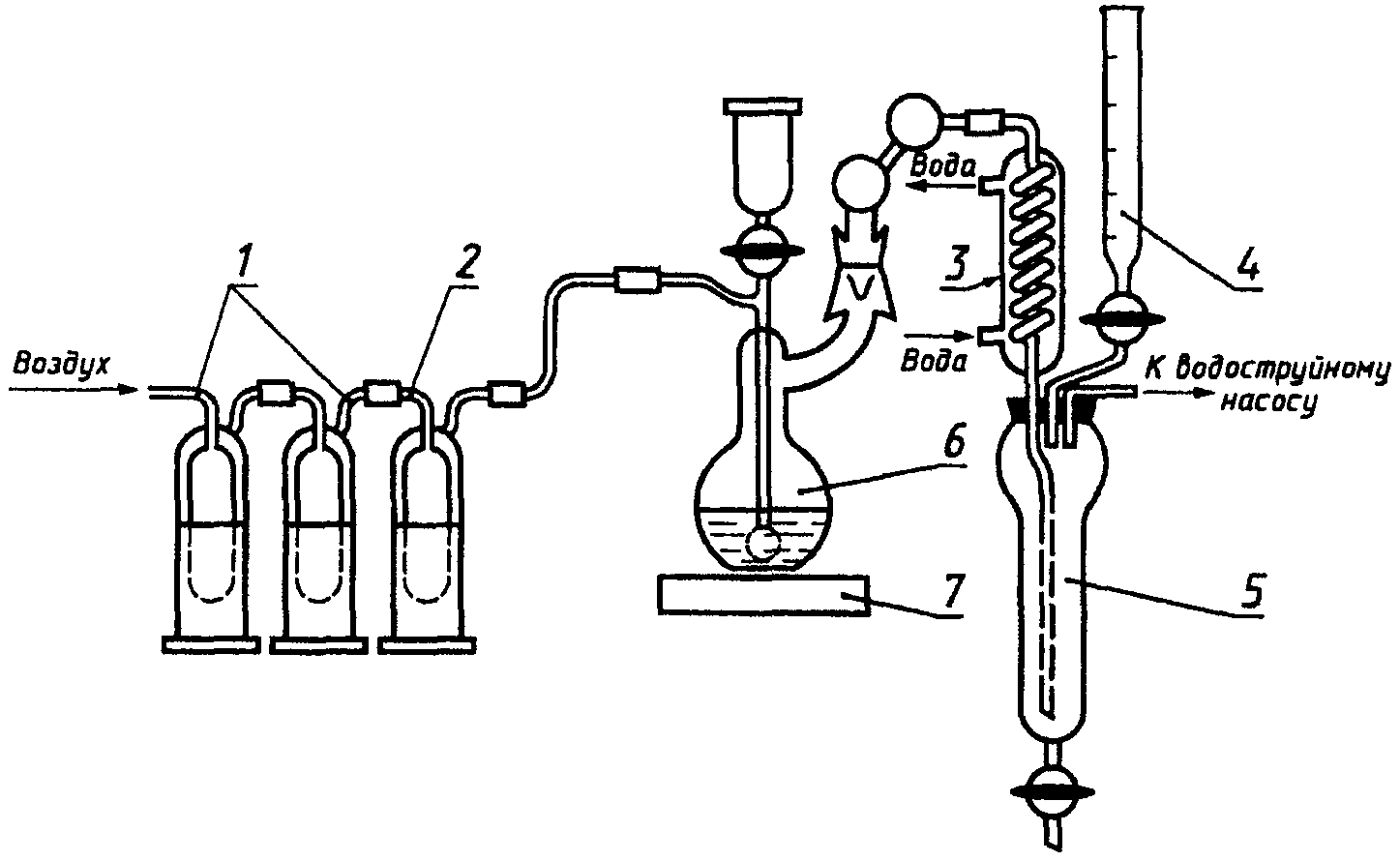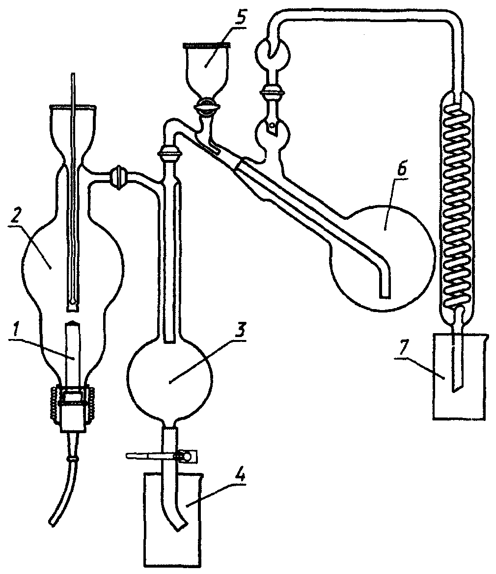 3, 2 - промывной сосуд, заполненный водой), электроплитки 7, дистилляционной колбы из термостойкого стекла вместимостью 500 см