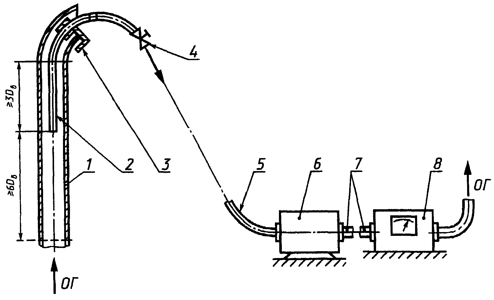 1 - выпускная труба машины (дизеля); 2 - пробоотборный зонд; 3 - зажим; 4 - газоподводящая трубка с краном; 5, 7 - газоподводящие трубы; 8 - дымомер; ОГ - отработавшие газы