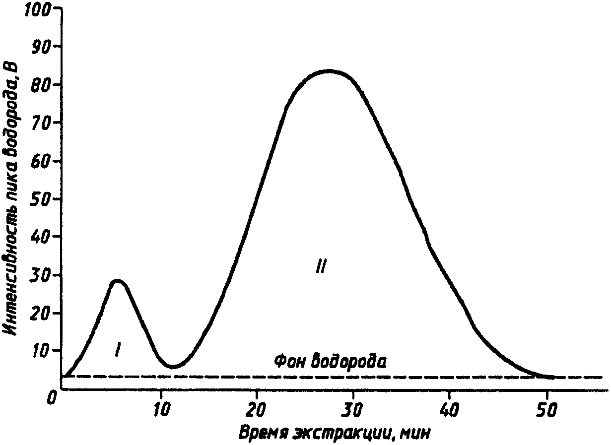 Выделяющиеся газы собирают в калиброванный объем, по изменению давления определяют их количество. Водород из газовой смеси удаляют диффузионным путем через нагретый палладиевый фильтр и по разности давлений определяют количество водорода в экстрагированной газовой смеси.