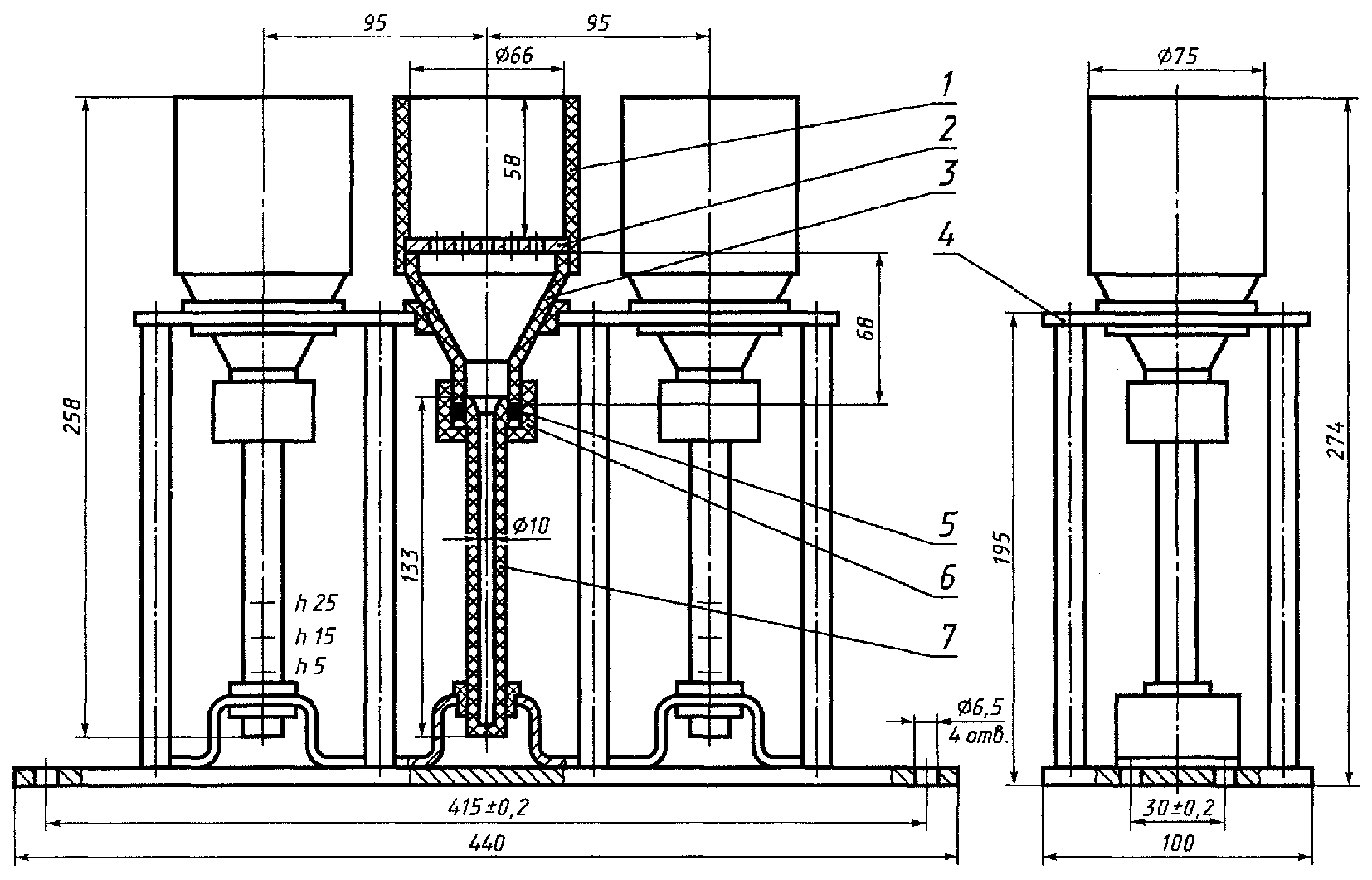Для проведения анализа блок из трех воронок с измерительными трубками устанавливают на платформу колебателя и закрепляют. Внизу цилиндрической части каждой воронки вплотную к стенкам помещают сито с отверстиями 0,75 диаметра испытуемых гранул и наливают водопроводную воду температурой от 18 до 20 °C на 3 - 5 мм ниже метки "Уровень воды".