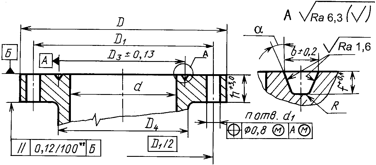 Обозначение фланца | Номинальный диаметр DN | Диаметр проходного отверстия d, не более | Наружный диаметр D | Диаметр делительной окружности центров отверстий под шпильки D1 | Диаметр проточки на привалочном торце D2 | Средний диаметр канавки под прокладку D3 | Большой диаметр шейки D4 | Диаметр отверстий под шпильки d1 | Количество отверстий под шпильки n | Полная высота тарелки h | Основная высота тарелки h1 | Ширина канавки b | Глубина канавки f | Радиус скругления канавки R | Применяемость составных частей фланцевых соединений | ||