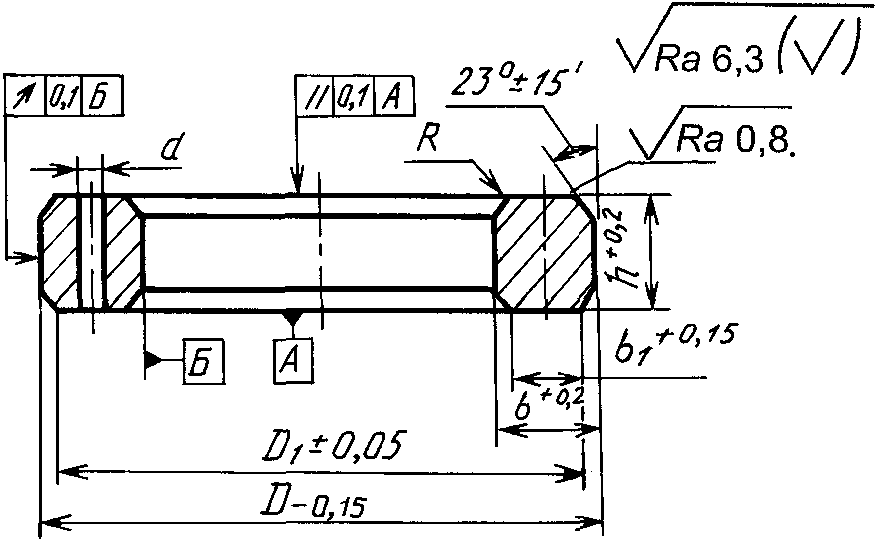 Обозначение прокладки | Наружный диаметр D | Наружный диаметр торца D1 | Ширина b | Ширина торца b1 | Высота h | Диаметр перепускного отверстия d | Радиус скругления R | Масса, кг, не более |