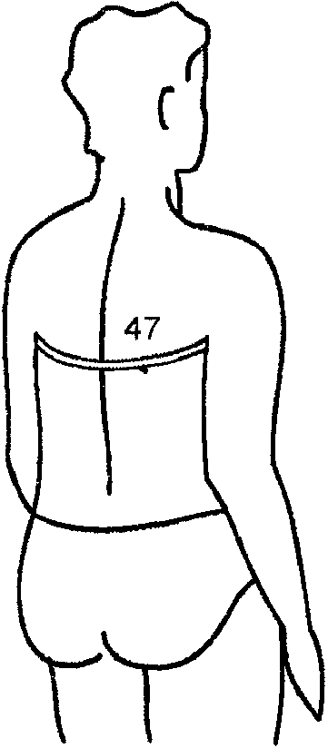 47 | Ширина спины | Измеряют по поверхности тела расстояние между задними углами подмышечных впадин. Нижний край ленты должен быть расположен на уровне отметки заднего угла подмышечной впадины на позвоночнике (см. размерный признак 11) | " | ![]() |