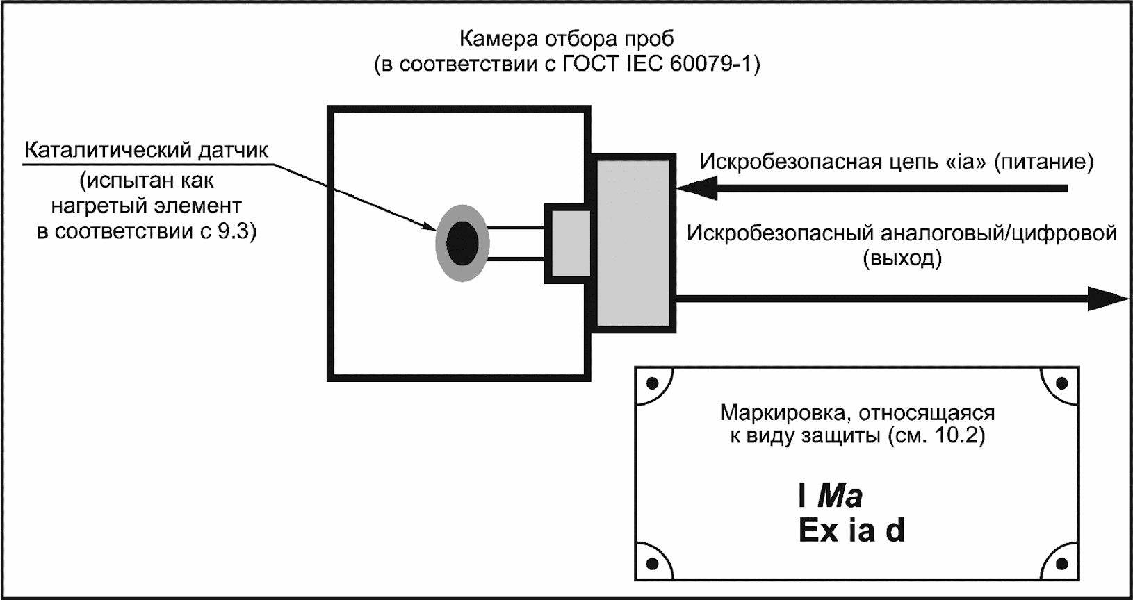 ГОСТ 30852.10, уровень "искробезопасная цепь "ia", и любые нагретые компоненты, связанные с чувствительными элементами и работающие при температуре свыше 530 °C, должны быть защищены следующим образом: