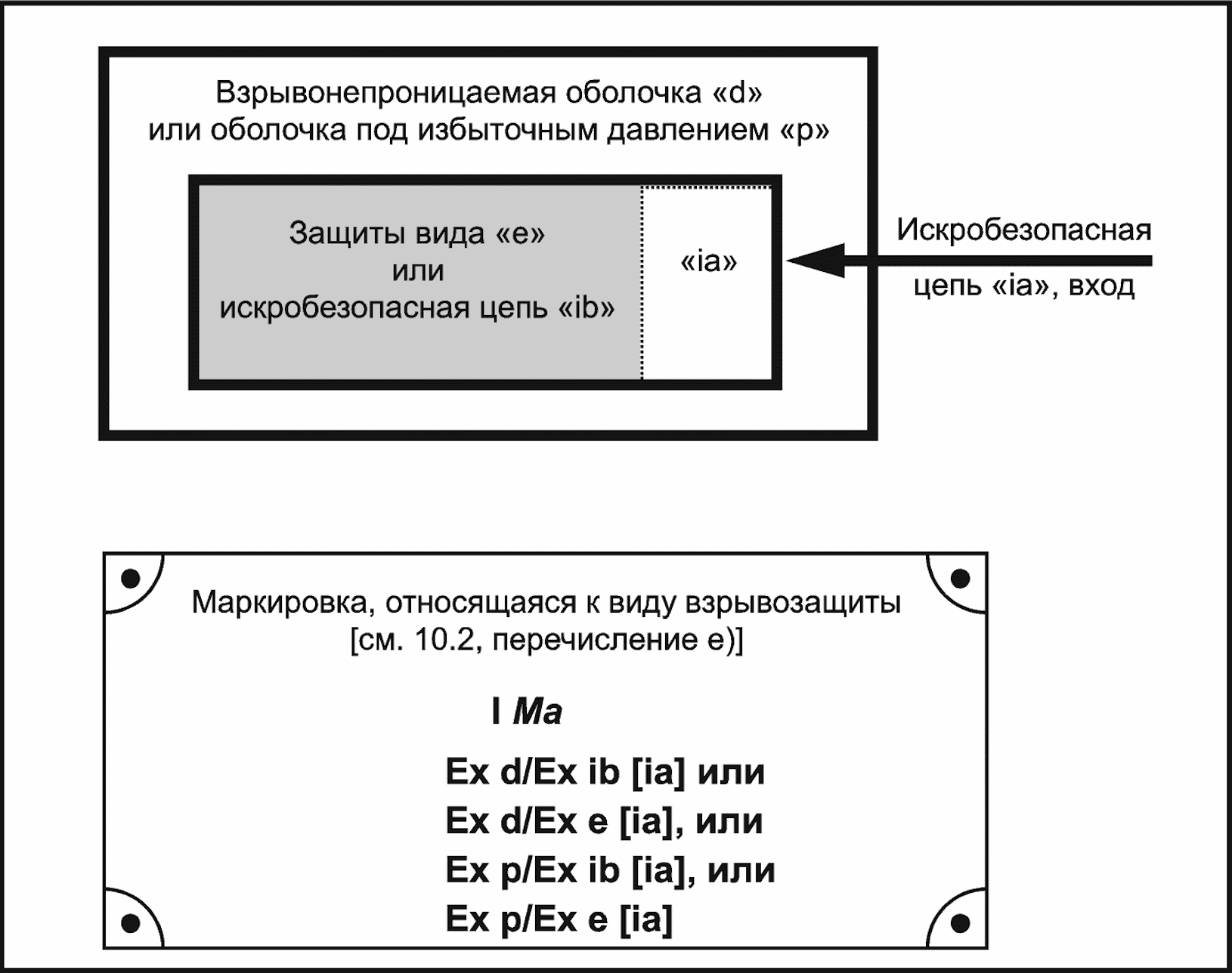 10.3 Если для различных частей оборудования используют различные виды защиты, на каждую отдельную часть должно быть нанесено обозначение используемого вида защиты. Если используют более одного вида защиты, обозначение основного вида защиты должно быть первым, за ним должны следовать обозначения других видов защиты.