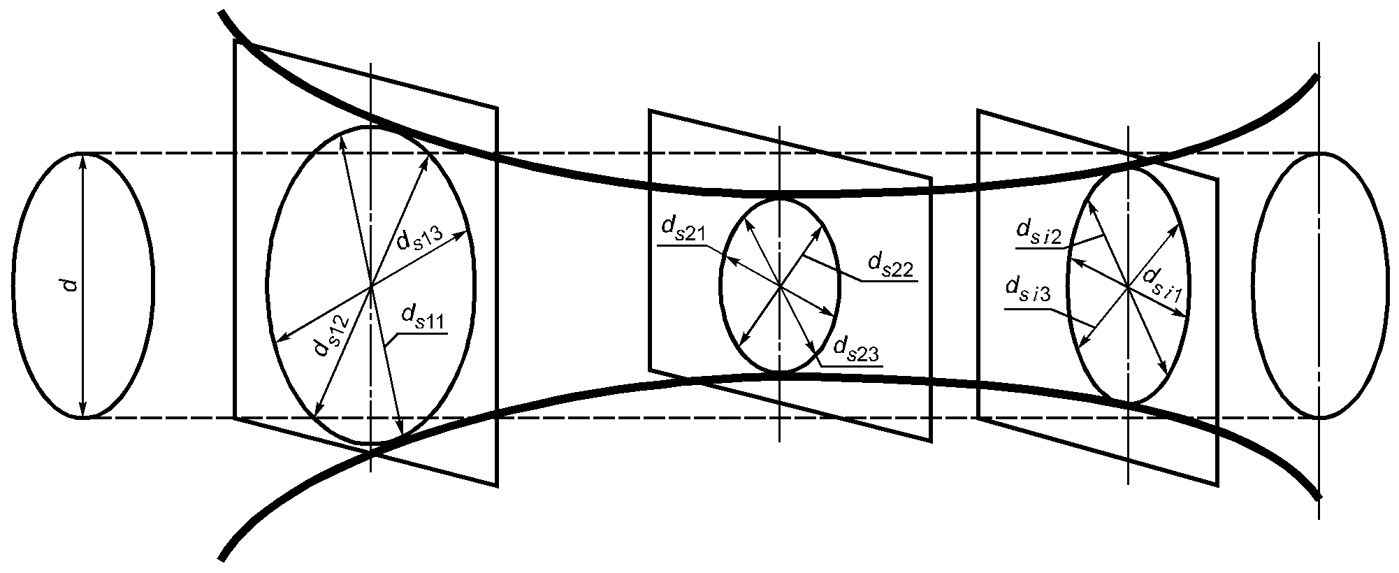 Средний диаметр отверстия детали в единичной плоскости представляет собой среднеарифметическое значение максимального и минимального диаметров в любой единичной плоскости, как показано в уравнениях, представленных в таблице А.2. Этот параметр в каждой единичной плоскости имеет одно значение.