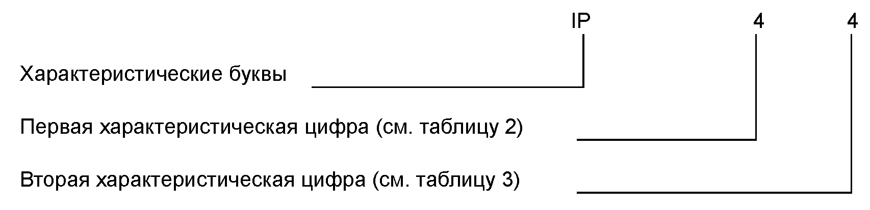 Обозначение степени защиты состоит из характеристических букв латинского алфавита IP и последующих двух характеристических цифр, указывающих на соответствие машин требованиям, описанным в таблицах 1,