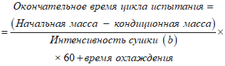 Как видно из примера, использование значения интенсивности сушки a для определения окончательного времени цикла испытания может привести к занижению результата определения на 5% и, следовательно, к необходимости проведения второго испытания, чтобы компенсировать падение интенсивности. Предполагается, что, если температура окружающей среды и относительная влажность в достаточной степени постоянны, интенсивность сушки b необходимо определять только раз, но если они изменяются, интенсивность сушки следует определять при новых условиях.