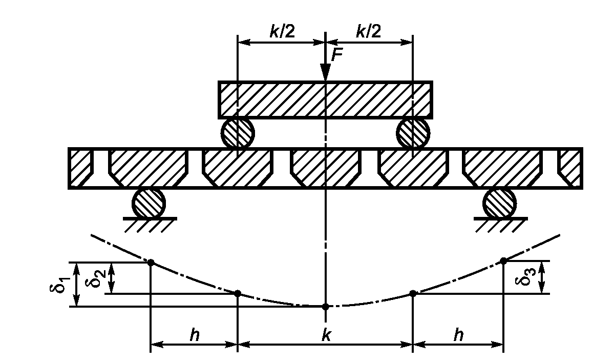 Приложить нагрузку F по указанной центральной линии нагружения и измерить соответствующий прогиб. Постепенно увеличивая нагрузку F, отмечая соответствующий прогиб через каждый интервал и строя график зависимости