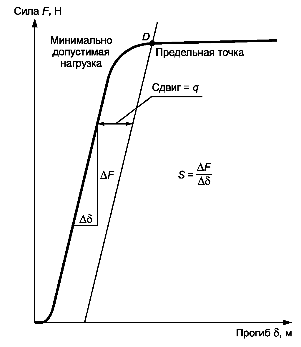 На графической зависимости прогиб/нагрузка проводят прямую линию, параллельную линейной части графика, но смещенную на q метров от нее, как показано на