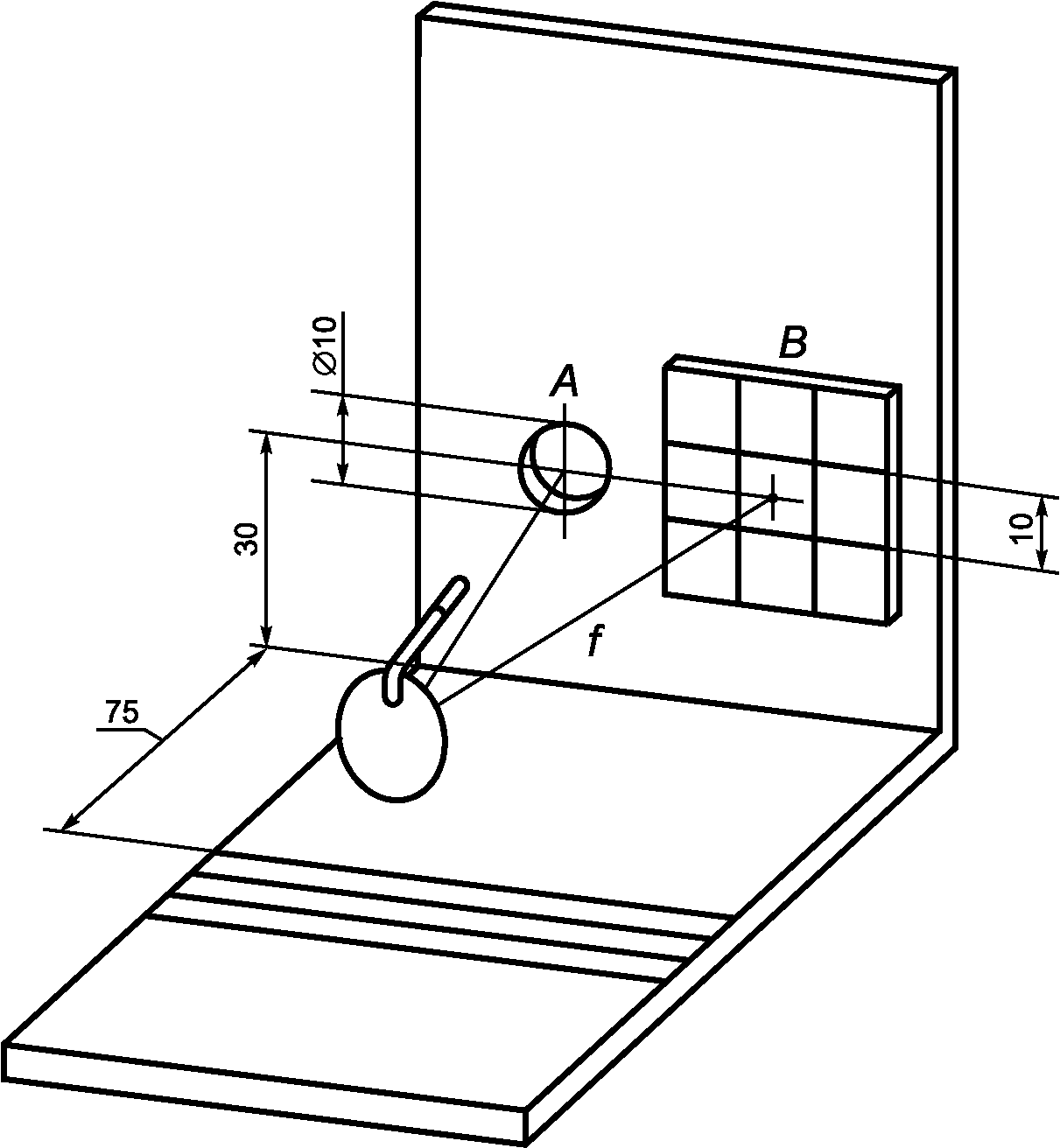В отверстие A диаметром 10 мм помещают перекрещивающиеся проволоки и располагают источник света позади устройства. Белую карточку B, размеченную на квадраты, устанавливают относительно отверстия A так, чтобы изображение перекрещивающихся проволок было в той же самой горизонтальной плоскости, что и перекрещивающиеся проволоки.