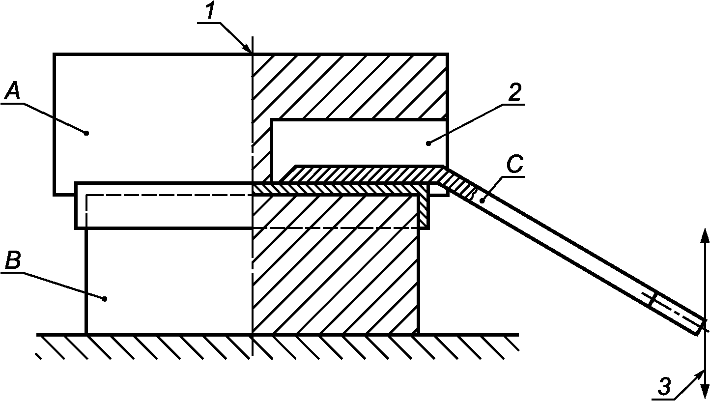 Компоненты A и B представляют собой две цилиндрические металлические детали такой формы, чтобы они внешними и внутренними контурами соответствовали корпусу и стержню зеркала. Паз в детали A изготовляют на 3 мм шире, чем стержень в месте соединения с корпусом. Глубина паза должна быть достаточной, чтобы гарантировать отсутствие контакта стержня зеркала C со стенками паза в процессе испытания.