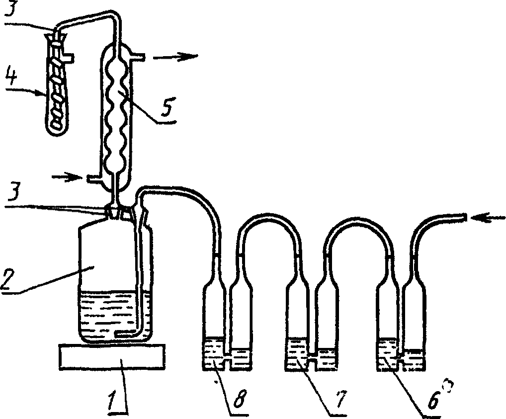 4. Правильность работы установки проверяют восстановлением стандартного раствора сульфатной серы. Для этого восстановительную смесь кипятят в течение 1 ч для дополнительной очистки от серы. Восстановительную смесь охлаждают, затем в приемник