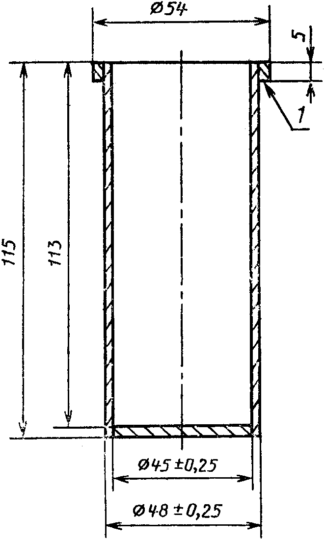 6.2. Металлический кожух (черт. 2) - латунный, цилиндрический, водонепроницаемый, плоскодонный внутренним диаметром (45 +/- 0,25) мм, наружным диаметром (48 +/- 0,25) мм и высотой 115 мм. Используют в качестве водяной бани.