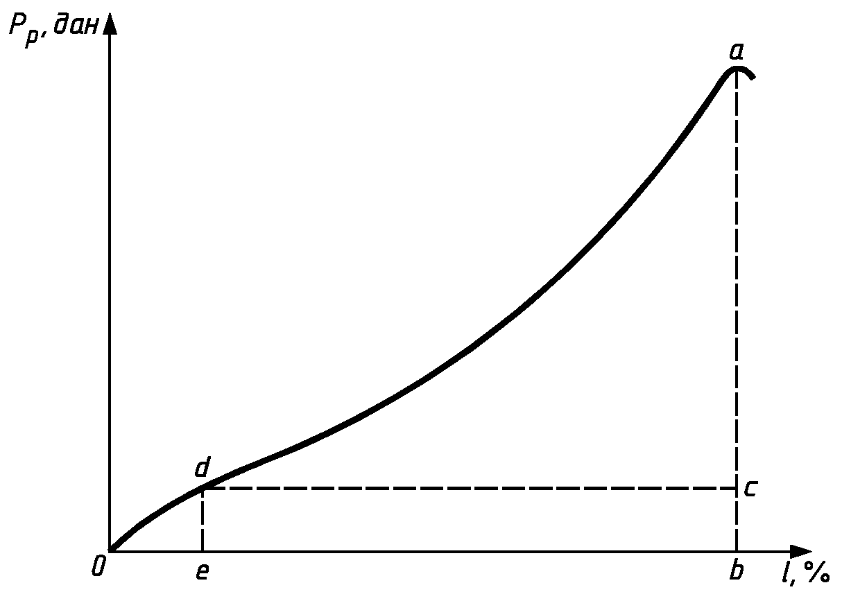 1. Из точки a на кривой опускают перпендикуляр на ось 1. Длина перпендикуляра ab соответствует значению фактической разрывной нагрузки элементарной пробы. С помощью измерительной металлической линейки измеряют длину перпендикуляра ab в миллиметрах.