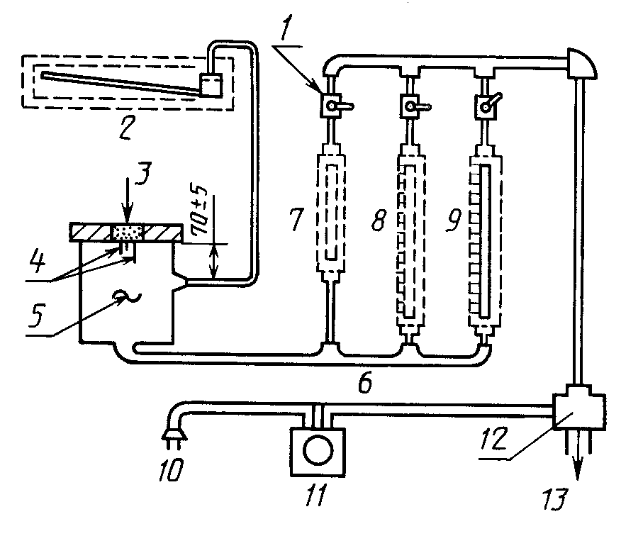 Примечание. Рекомендуются расходомеры с минимальной шкалой 250 мм. Расходомеры с пределом измерения 0 - 10 дм3/с применяют для испытания всех эластичных полимерных материалов.