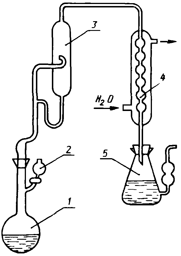 4 - холодильник стеклянный шариковый; 5 - колба коническая