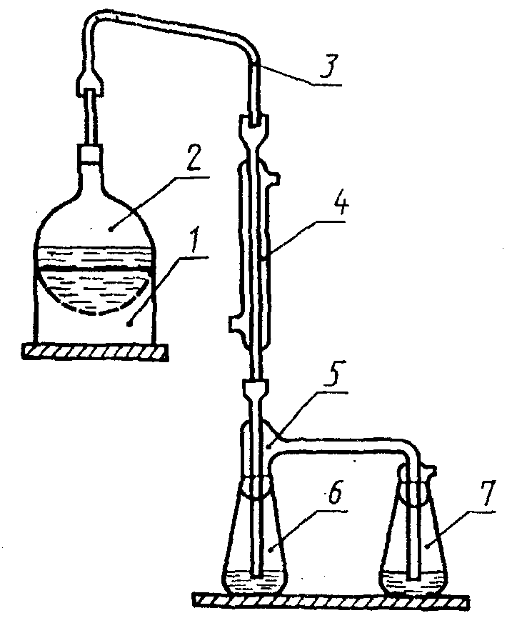 К нижнему концу трубки холодильника через насадку 5 присоединяют последовательно две колбы вместимостью 250 см3: приемную 6 и контрольную 7. В приемную колбу приливают 30 см3, а в контрольную - 15 см3 10%-го водного раствора аммиака.