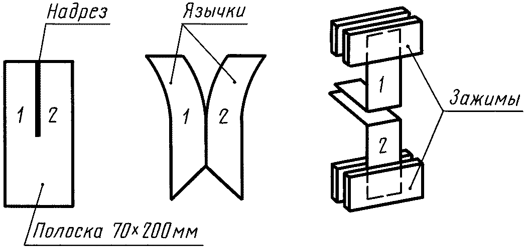 Пример раскроя элементарных проб для испытаний, удовлетворяющих вышеуказанным условиям, представлен на чертеже